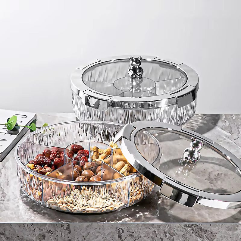 Add a touch of playful elegance and organized charm to your gatherings with our Deluxe Snacks & Candy Tray with Bear Top & Airtight Lid. This delightful serving dish is perfect for presenting an array of treats, dried fruits, nuts, candies, or appetizers in a beautifully compartmentalized fashion. Crafted from high-quality, transparent material, the tray features a stylishly textured 'crystal-look' base that catches the light, while the clear lid allows for easy viewing of contents.